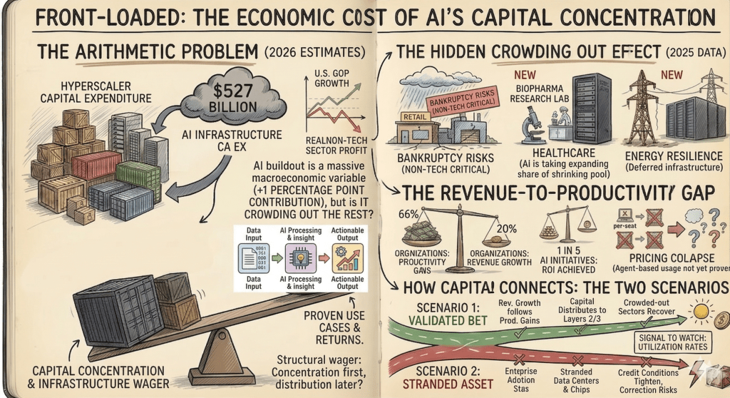 In the second, the revenue doesn’t materialize on the timeline the debt requires. Enterprise adoption stalls. The productivity-to-revenue gap persists. Credit conditions tighten as the scale of the infrastructure bet becomes harder to justify. Stranded assets accumulate in data centers and chip inventories. The sectors that were crowded out during the concentration phase find themselves emerging into a tighter capital environment, having missed the investment window they needed.